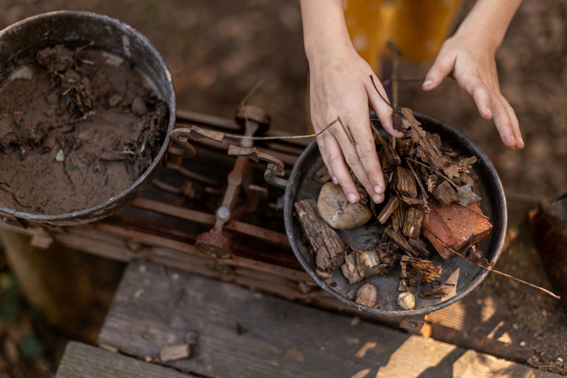 Wir verzichten bewusst auf Spielzeug. Stattdessen gibt es alles was der Wald bietet, sowie kindgerechtes Werkzeug. Am Werkplatz werden körperliche und emotionale Erfahrungen gesammelt sowie physikalische Gesetzmäßigkeiten und technische Aspekte angeeignet. Dabei wird der lebenspraktische Ansatz verfolgt, welcher sich darauf bezieht, den Kindern nachvollziehbare Aktivitäten beizubringen, die im Leben brauchbar sind.